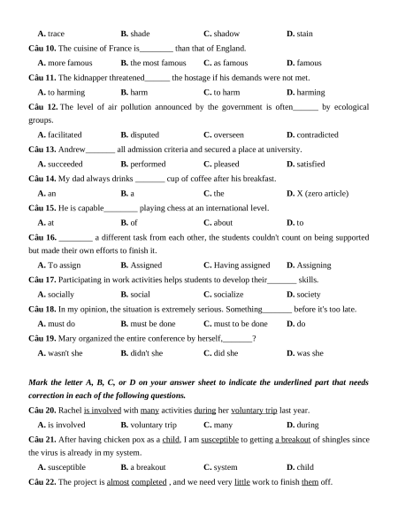 Câu 20. Rachel is involved with many activities during her voluntary trip last year. A. is involved B. voluntary trip C. many D. during