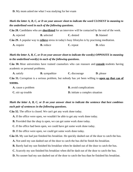 Câu 30. Most universities have trained counselors who can reassure and console students having academic or personal problems. A. satisfy B. sympathize C. discourage D. please