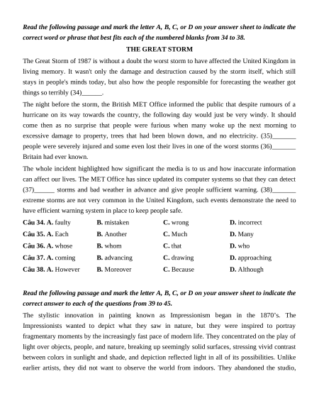 Câu 15. He is capable________ playing chess at an international level. A. at B. of C. about D. to