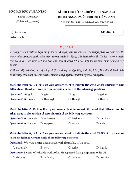 Đề thi thử tốt nghiệp Tiếng Anh Sở GD ĐT Thái Nguyên năm 2024