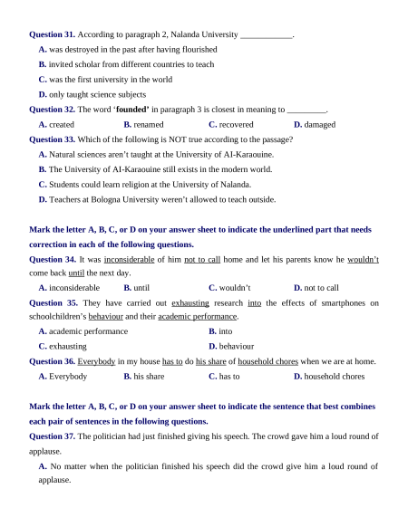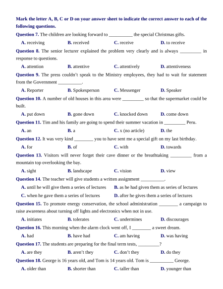 Mark the letter A, B, C or D on your answer sheet to indicate the correct answer to each of the following questions.