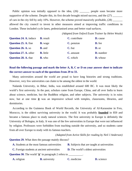 (Adapted from Oxford Exam Trainer by Helen Weale) Question 24. A. induce B. result C. contribute D. cause Question 25. A. fine B. wage C. pension D. fee Question 26. A. so B. and C. but D. or Question 27. A. other B. little C. amount D. number Question 28. A. that B. who C. which D. whose