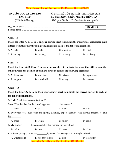 Đề thi thử tốt nghiệp Tiếng Anh Sở GD&ĐT Bạc Liêu năm 2024