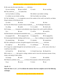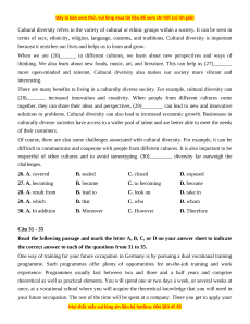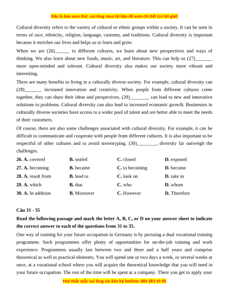 respectful of other cultures and to avoid stereotyping. (30)________, diversity far outweigh the challenges. 26. A. covered B. sealed C. closed D. exposed 27. A. becoming B. became C. to becoming D. become 28. A. result from B. lead to C. look on D. take in 29. A. which B. that C. who D. whom 30. A. In addition B. Moreover C. However D. Therefore Câu 31 - 35