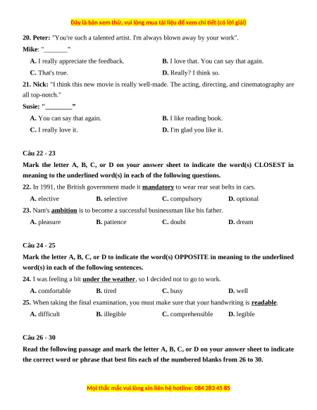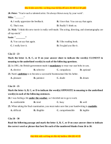 25. When taking the final examination, you must make sure that your handwriting is readable. A. difficult B. illegible C. comprehensible D. legible Câu 26 - 30
