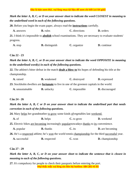 21. I think it's impossible to abolish school examinations. They are necessary to evaluate students' progress. A. stop B. distinguish C. organize D. continue Câu 22 - 23