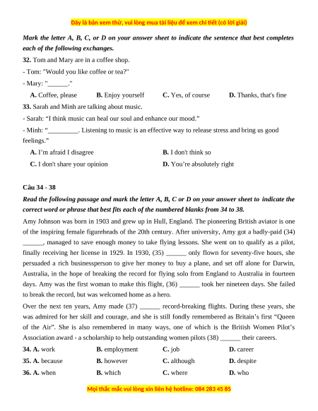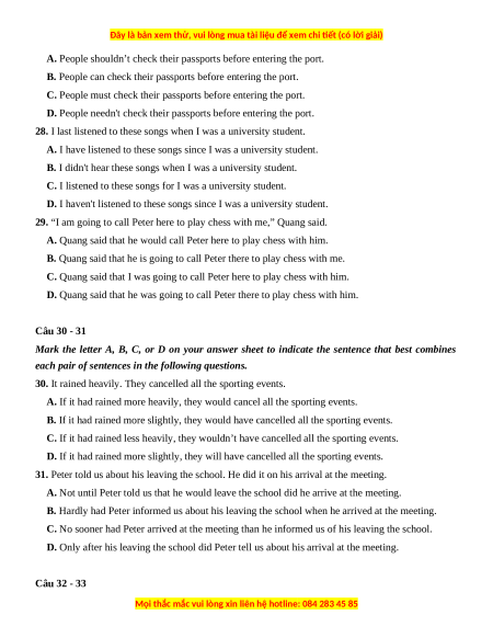 D. Only after his leaving the school did Peter tell us about his arrival at the meeting. Câu 32 - 33