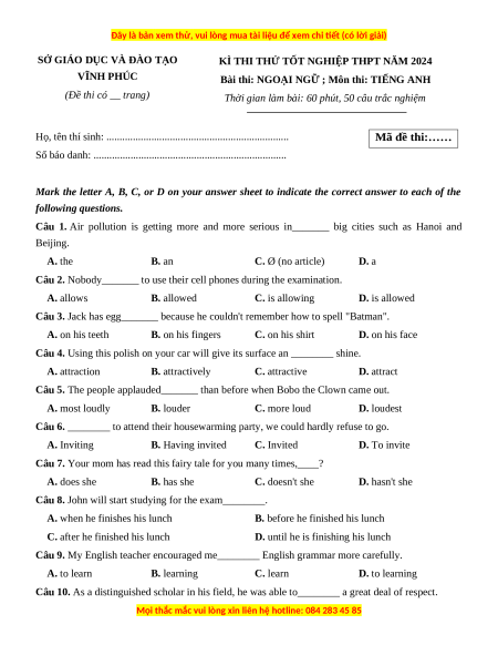 KÌ THI THỬ TỐT NGHIỆP THPT NĂM 2024 VĨNH PHÚC