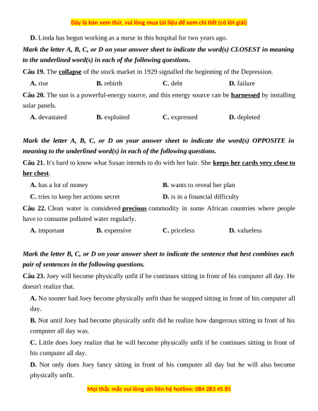 Câu 19. The collapse of the stock market in 1929 signalled the beginning of the Depression. A. rise B. rebirth C. debt D. failure