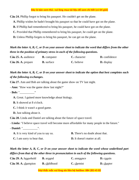 three in the position of primary stress in each of the following questions. Câu 25. A. audience B. computer C. character D. confidence Câu 26. A. prepare B. surface C. believe D. display