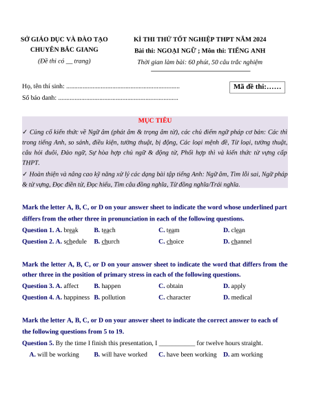 Đề thi thử tốt nghiệp Tiếng Anh trường Chuyên Bắc Giang năm 2024