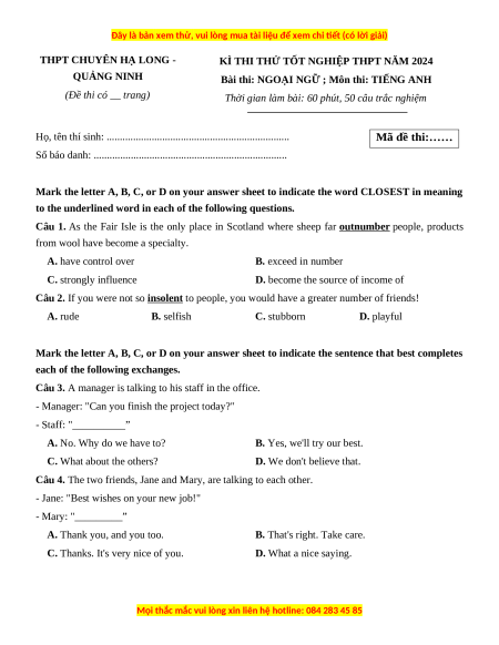 Đề thi thử tốt nghiệp Tiếng Anh trường THPT Chuyên Hạ Long - Quảng Ninh năm 2024