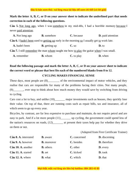 (Adapted from First Certificate Trainer) Câu 8. A. interested B. aware C. concerned D. discerning Câu 9. A. however B. moreover C. besides D. therefore Câu 10. A. another B. others C. other D. every Câu 11. A. started B. set C. kicked D. took Câu 12. A. where B. what C. which D. that