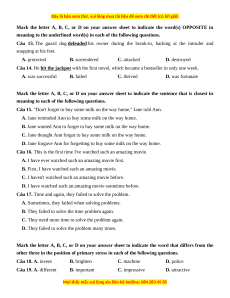 other three in the position of primary stress in each of the following questions. Câu 18. A. invent B. brighten C. machine D. police Câu 19. A. different B. important C. impressive D. attractive