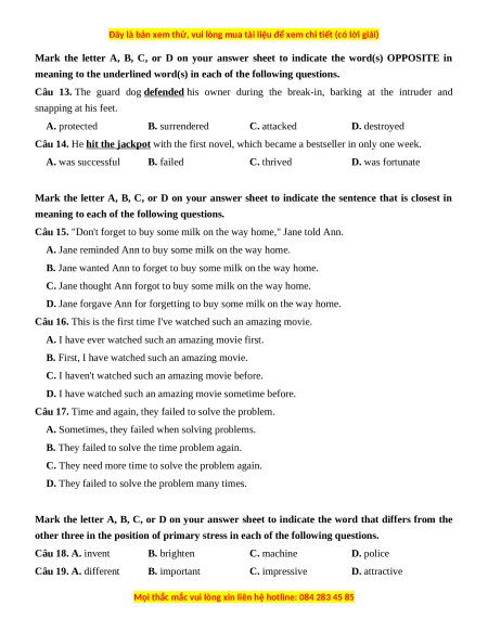 Câu 14. He hit the jackpot with the first novel, which became a bestseller in only one week. A. was successful B. failed C. thrived D. was fortunate