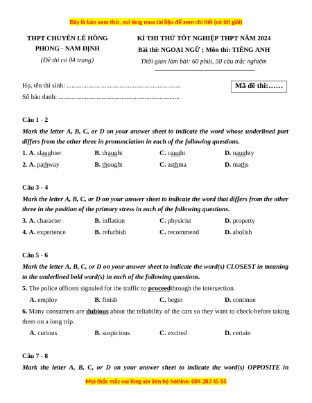 Đề thi thử tốt nghiệp Tiếng Anh trường THPT Chuyên Lê Hồng Phong - Nam Định năm 2024
