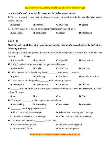 8. This new magazine is known for its comprehensivecoverage of news. A. superficial B. indifferent C. casual D. inadequate Câu 9 - 23