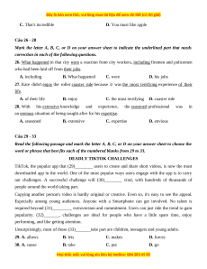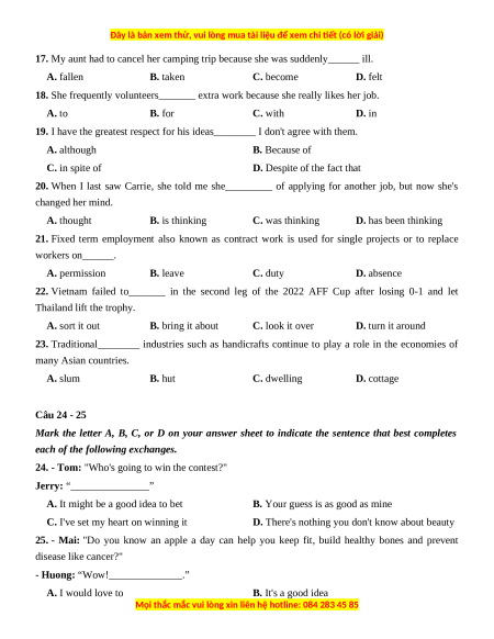 23. Traditional________ industries such as handicrafts continue to play a role in the economies of many Asian countries. A. slum B. hut C. dwelling D. cottage Câu 24 - 25