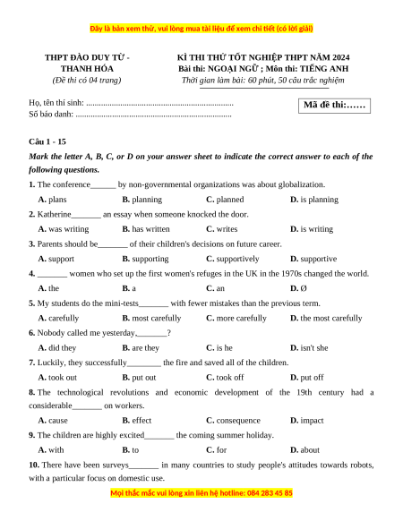 Đề thi thử tốt nghiệp Tiếng Anh trường THPT Đào Duy Từ - Thanh Hóa năm 2024