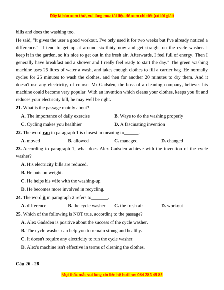 D. Alex's machine isn't effective in terms of cleaning the clothes. Câu 26 - 28