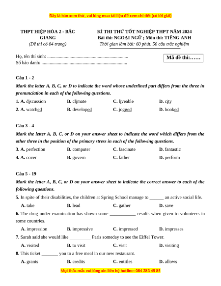 pronunciation in each of the following questions. 1. A. discussion B. climate C. liveable D. city 2. A. watched B. developed C. jogged D. booked Câu 3 - 4