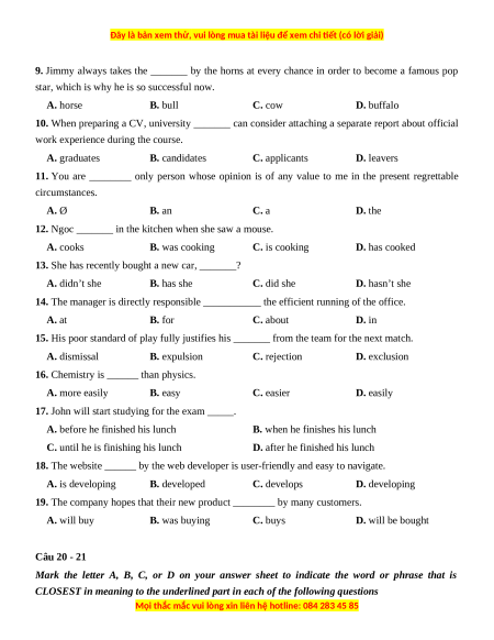 19. The company hopes that their new product ________ by many customers. A. will buy B. was buying C. buys D. will be bought Câu 20 - 21