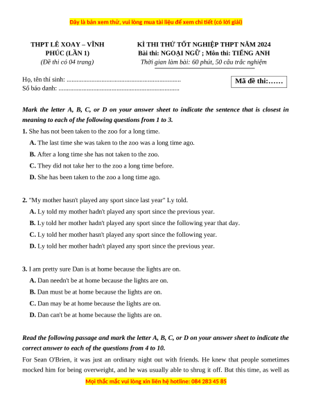 Đề thi thử tốt nghiệp Tiếng Anh trường THPT Lê Xoay - Vĩnh Phúc lần 1 năm 2024