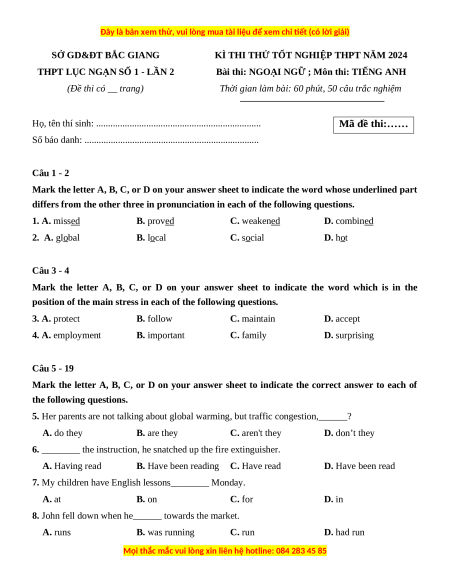 Đề thi thử tốt nghiệp Tiếng Anh trường THPT Lục Ngạn số 1- Bắc Giang lần 2 năm 2024