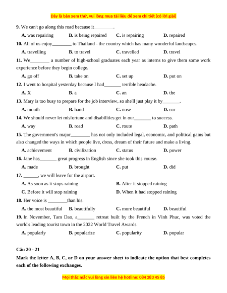 world's leading tourist town in the 2022 World Travel Awards. A. popularly B. popularize C. popularity D. popular Câu 20 - 21
