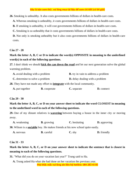 D. Not only is smoking unhealthy but it also costs governments billions of dollars in health-care costs. Câu 27 - 28