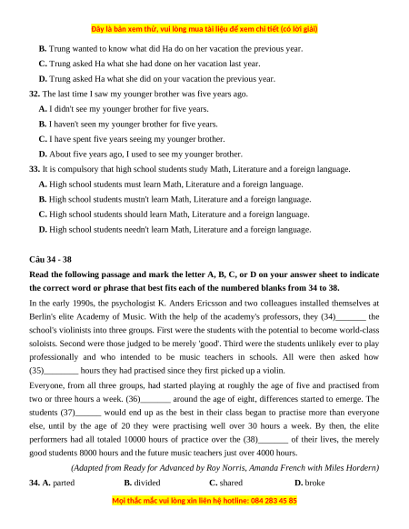 30. Wilson is a sociable boy. He makes friends at his new school quite easily. A. nervous B. careful C. shy D. friendly Câu 31 - 33