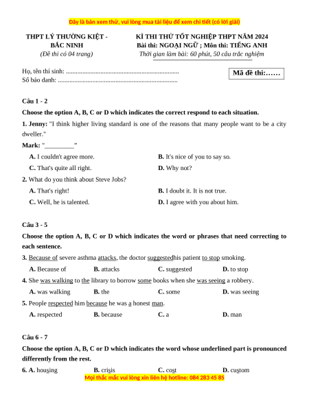 Đề thi thử tốt nghiệp Tiếng Anh trường THPT Lý Thường Kiệt - Bắc Ninh năm 2024