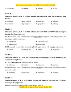13. Mother Teresa was a Roman Catholic nun who devotedher life to serving the poor and destitute around the world. A. committed B. dedicated C. superficial D. attended Câu 14 - 16