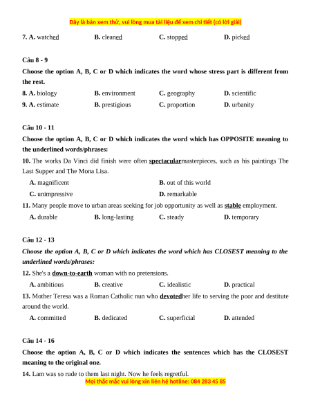 Choose the option A, B, C or D which indicates the word whose stress part is different from the rest. 8. A. biology B. environment C. geography D. scientific 9. A. estimate B. prestigious C. proportion D. urbanity Câu 10 - 11