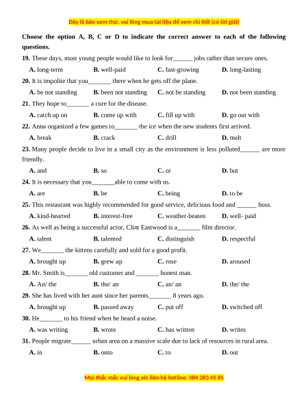 11. Many people move to urban areas seeking for job opportunity as well as stable employment. A. durable B. long-lasting C. steady D. temporary Câu 12 - 13
