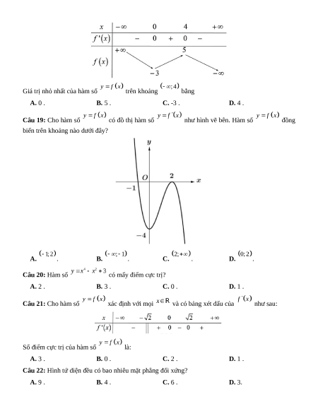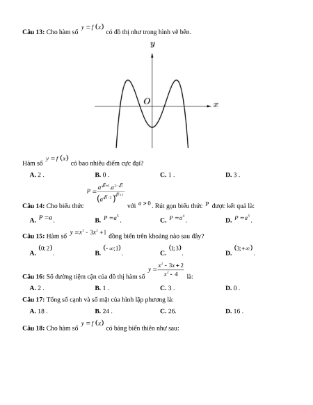 Câu 17: Tổng số cạnh và số mặt của hình lập phương là: A. 18 . B. 24 . C. 26. D. 16 . Câu 18: Cho hàm số