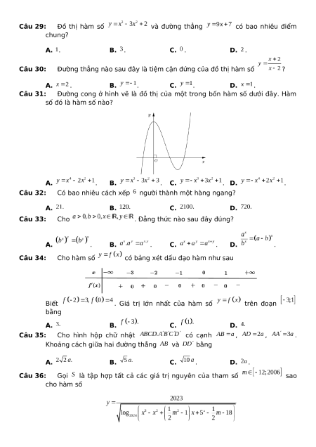 Đường cong ở hình vẽ là đồ thị của một trong bốn hàm số dưới đây. Hàm số đó là hàm số nào? A. . B. . C. . D. . Câu 32:
