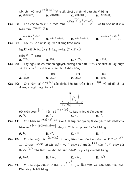 . Giá trị lớn nhất của hàm số trên đoạn bằng A. B. C. D. Câu 35: Cho hình hộp chữ nhật có cạnh , , .