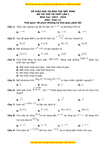 Đề thi thử tốt nghiệp Toán Sở GD Bắc Ninh lần 1 năm 2024