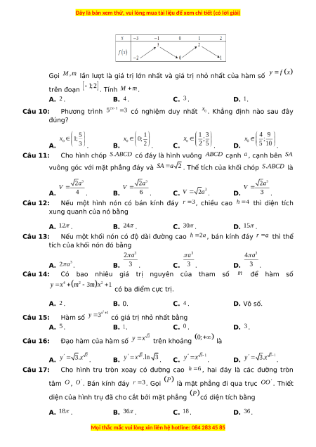 lần lượt là giá trị lớn nhất và giá trị nhỏ nhất của hàm số trên đoạn . Tính . A. . B. . C. . D. . Câu 10: Phương trình