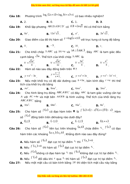 Câu 18: Phương trình có bao nhiêu nghiệm? A. 2. B. 0. C. 1. D. 3. Câu 19: Khối lập phương có thì có thể tích bằng A. . B. . C. . D. . Câu 20: