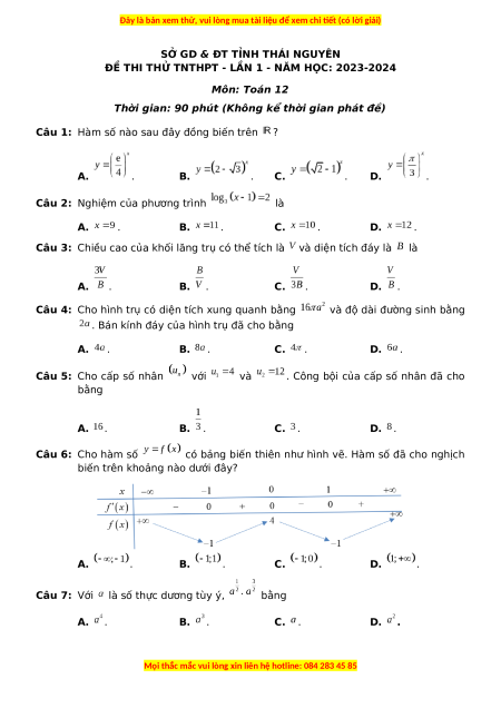 ĐỀ THI THỬ TNTHPT - LẦN 1 - NĂM HỌC: 2023-2024 Môn: Toán 12