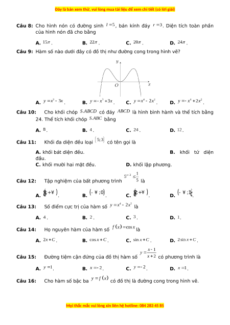 Câu 9: Hàm số nào dưới đây có đồ thị như đường cong trong hình vẽ? A. . B. . C. . D. . Câu 10: Cho khối chóp có đáy