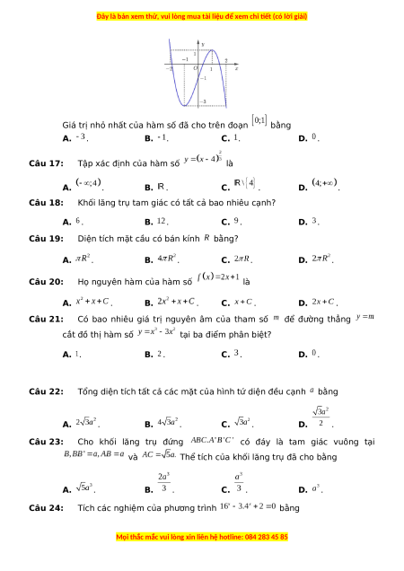 Giá trị nhỏ nhất của hàm số đã cho trên đoạn bằng A. . B. . C. . D. . Câu 17: