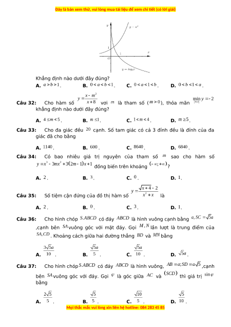Chu vi đường tròn lớn của mặt cầu đã cho bằng A. . B. . C. . D. . Câu 31: Cho đồ thị hàm số và như hình vẽ.
