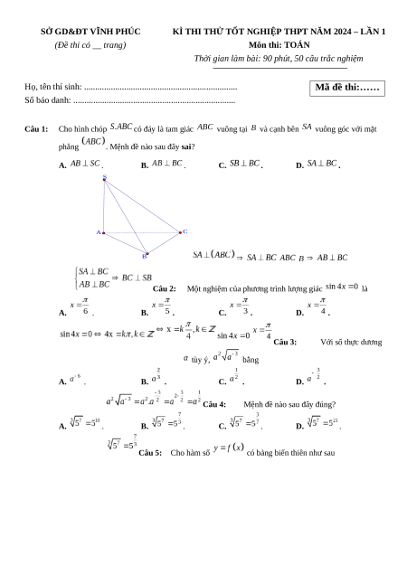 Đề thi thử tốt nghiệp Toán Sở GD Vĩnh Phúc lần 1 năm 2024