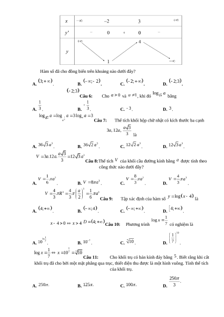 Hàm số đã cho đồng biến trên khoảng nào dưới đây? A. . B. . C. . D. . Câu 6: Cho và , khi đó bằng A. . B. . C. . D. . Câu 7: