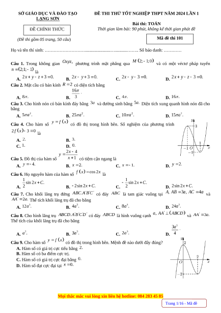 ĐỀ THI THỬ TỐT NGHIỆP THPT NĂM 2024 LẦN 1 LẠNG SƠN Bài thi: TOÁN ĐỀ CHÍNH THỨC