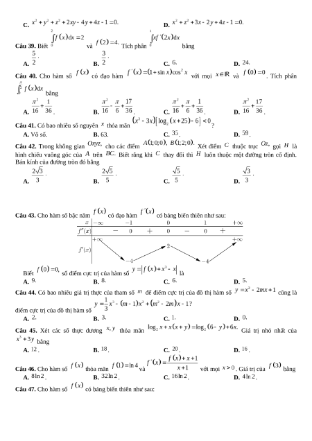 và trục hoành như hình bên. Tích phân bằng A. . B. . C. . D. . Câu 31. Cho các số thỏa mãn Giá trị của bằng A. B. C. D.