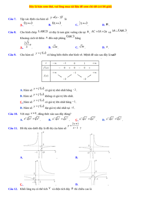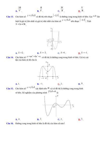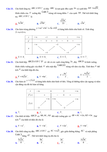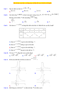Câu 12. Khối lăng trụ có thể tích và diện tích đáy thì chiều cao là A. . B. . C. . D. . Câu 13. Cho hàm số
